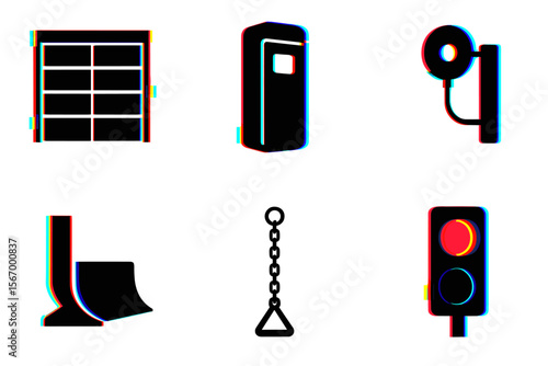 vector, icon, illustration, glitch, icon, garage, door, phone, booth, water, pump, lounge, chair, hanging, handle, traffic, light, symbol, silhouette, black, white, graphic, design, retro, digital, art, abstract, minimal, red, blue, green, distortion