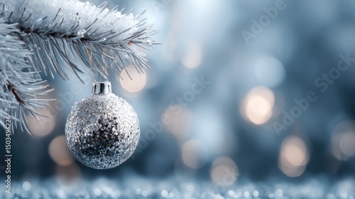 Glittering Globe Winters Elegance On Snowy Pine with Shimmering Bokeh.