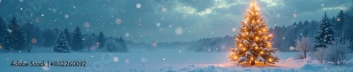 Glittering gold Christmas tree amidst icy fog, wintry scene, cloudy sky, cold climate