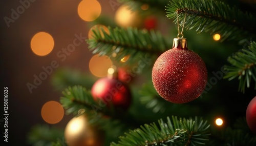 Glittering ornaments shine on the tree's branches, sparkling, glittering, festive