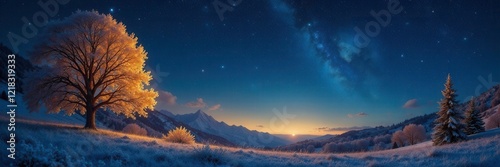 Glittering starry night sky with silver and gold trees, nature, glitter, gold