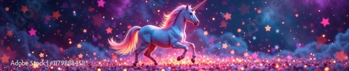 Glittering unicorn frolics amidst a scattering of star-shaped confetti on a cosmic background, radiating pure delight, joy, cosmos, happiness