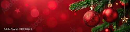 Glittery red Christmas tree baubles with glitter and star, garlands, red, holiday