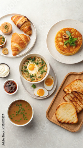 Global Breakfast Flat Lay with Variety of Foods