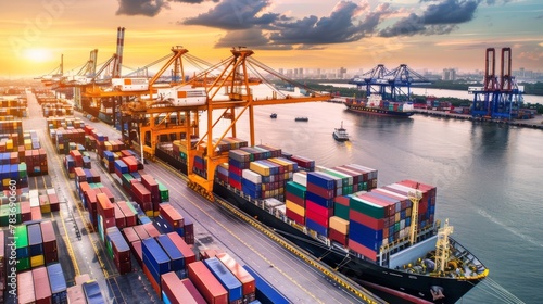 Global business logistics import export and container cargo freight ship during loading at industrial port by crane, container handlers, cargo plane, truck on highway