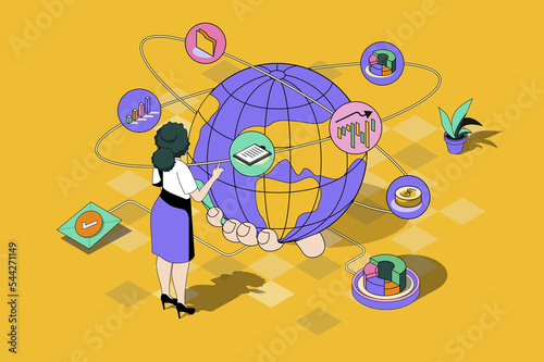 Global business web concept in 3d isometric design. Woman works and develops international company, sets tasks for employees and expands business. Web illustration with people isometry scene