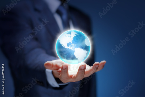Global business world in hand. Businessman wear suit holding the planet earth on blue background. Man show USA world map for communicate, connection, technology, worldwide, network, internet concept.