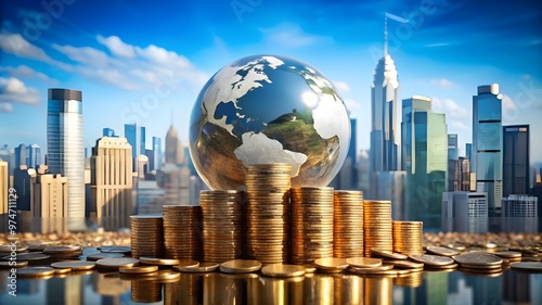 money, economy, earth, invest, global, coin, concept, globe, wealth, foreign, gold, exchange, business, currency, stock, growth, financial, market, value, industry, technology, blue, stack, profit, pile, interest, earth, generating, success, worldwide, continent, amount, quantity, finance, investment, management, banking, symbolism, debt, costly, expensive, nobody, richness, unreal
