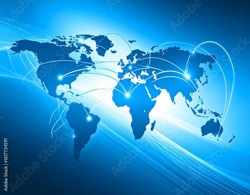 Global Network Connection: An artistic representation of the world map is adorned with interconnected lines symbolizing a global network, set against a luminous blue background.