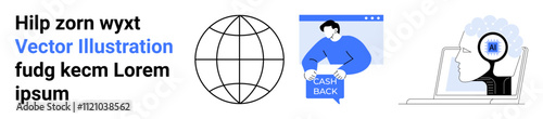 Globe grid icon, person holding Cash Back sign, head with gear on laptop. Ideal for finance, AI, technology, network, global business, marketing, web design. Landing page