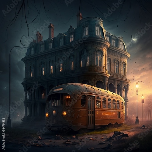 Gloomy fantasy old house scene at night with an old bus standing by. scary, calm and gloomy mood - AI generated