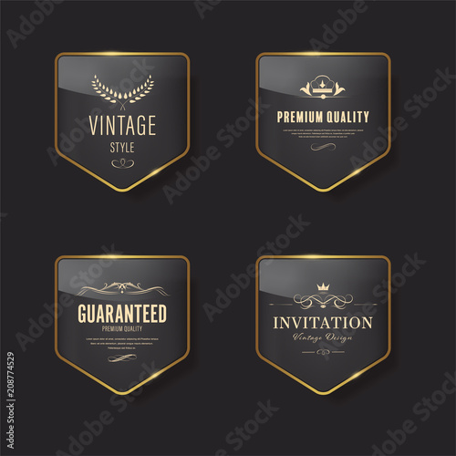 Glossy banner with gold metal frame. Vintage badges design.