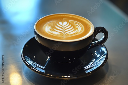 Glossy Black Cup Showcasing Intricate Latte Art on Reflective Surface