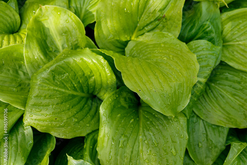 Glossy green leaves. Natural backdrop. Beautiful water drops on the leaf after rain. Beautiful abstract background, copy space. Creative layout made of green leaves. Nature texture