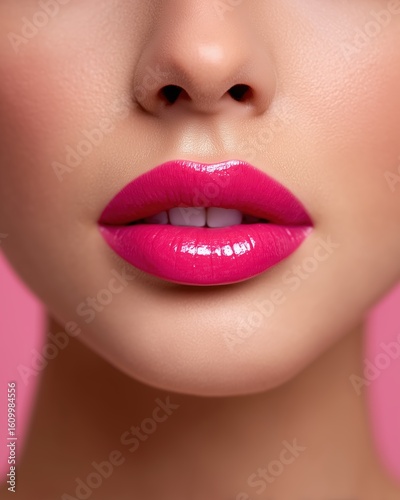 Glossy pink lips close up with soft light for beauty and cosmetics advertising.