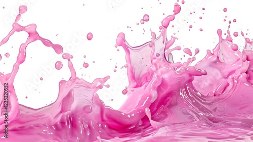 Glossy pink liquid splashes in motion against a white background, forming a dynamic abstract