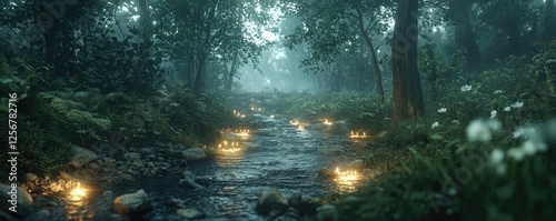 Glow forest idea. A serene forest stream with glowing lights and lush greenery under a misty atmosphere.