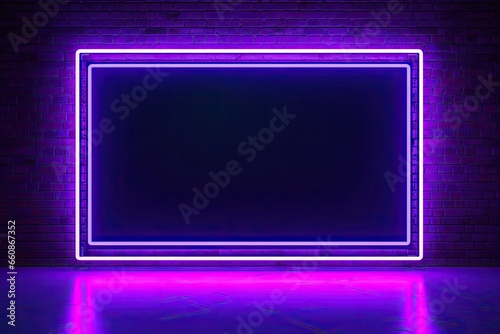 Glow frame in dark. Vibrant neon dreams. Futuristic interior. Electric elegance. Illumination in black background. Design and lights