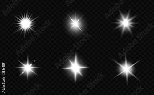 Glow isolated white light effect set, lens flare, explosion, glitter, line, sun flash and stars. Abstract special effect element design. Shine ray with lightning. Set of gold bright beautiful stars
