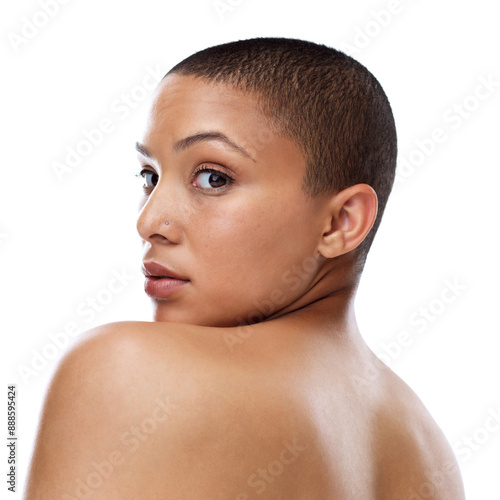 Glow, woman and confident for skincare in studio for natural beauty on white background. Female person, portrait and empowerment with skin treatment, transformation and self care for wellness