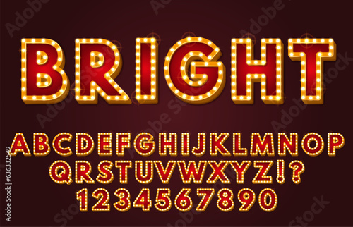 Glowing alphabet display font. Retro letters and numbers with light bulbs frames, nostalgic light sign lettering. Vintage signboard design vector bundle