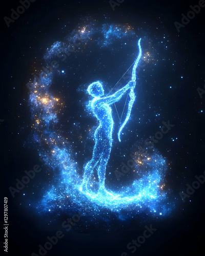 archer, archery, bow, arrow, cosmic, space, star, nebula, galaxy, glowing, light, blue, energy, mystical, magical, fantasy, art, digital, artwork, illustration, graphic, design, abstract, surreal, vibrant, powerful, graceful, elegant, skill, precision, aim, target, warrior, hunter, mythology, legend, celestial, night, dark, shimmer, sparkle, radiant, aethereal, dreamlike, mysterious, majestic, intense