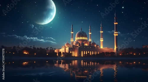mosque, eid, moon, hospital, festival, celebration, candle, lantern, fasting, religion, minaret, islam, background, illustration, night sky, gold, decoration, border, bokeh, tower, concept