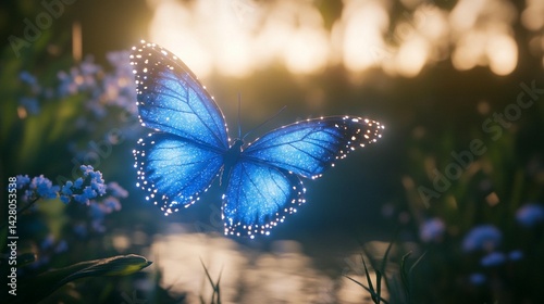 butterfly, blue, glowing, nature, insect, wing, magical, fantasy, serene, beautiful, light, sparkle, wildlife, photo, art, digital artwork, image, illustration, scene, background, environment, design, peaceful, aethereal, vibrant, colours, delicate, flora, fauna, soft, shimmer, dreamlike, wonder, mysterious, summer, evening, twilight, grass, flower, plant, water, tranquil, calm, beauty, artistic, creative, visual