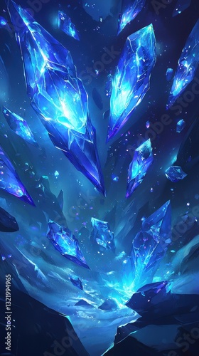 crystal, blue, glow, light, dark, fantasy, magical, nature, ice, rock, beautiful, vibrant, texture, gemstone, environmental, scenery, abstract, illumination, landscape, dramatic, enchanting, serene, cosmic, celestial, adventure, mysterious, shining, depth, design, artistic, stunning, brilliant, radiant, luminescent, aethereal, tranquil, geology, mineral, sparkling, drawing, digital, visual, creativity, artwork