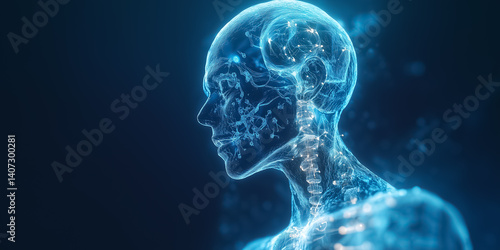 Glowing blue digital human figure in profile showcasing intricate neural connections and brain activity. High-tech sci-fi environment with dark background