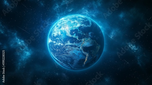 Glowing blue digital representation of Earth with vibrant cosmic background