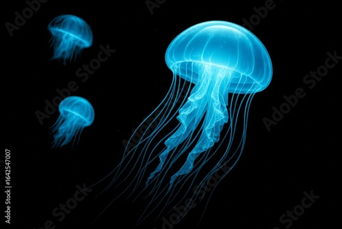 jellyfish, glowing, background, light, concept, ocean, sea, underwater, marin, animal, aquatic, creature, blue, digital, tentacle, deep, abyss, mysterious, elegant, fantasy, surreal, graphic, nature, movement, fluid, transparent, aglow, biology, dark, wild, exotic, environment, flare, semitransparent, motion, line, texture, shape, symmetry, flow, pattern, organic, dreamy, ai, generative, illustration