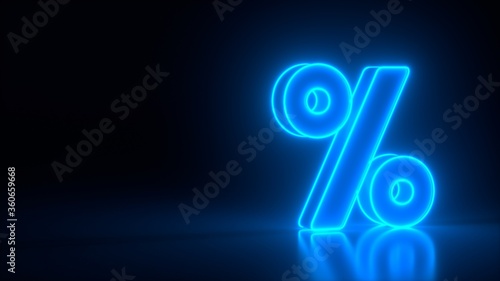 Glowing blue percent symbol on black dark background. Seasonal sales and discounts. Discount, sale sign, neon lights. Business colorful concept. 3d rendering.