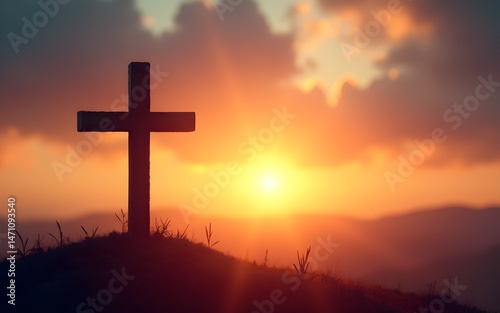 Glowing Christian cross on hilltop at sunset with dramatic sky. Easter, Good Friday symbol. Hope and faith concept for religious greeting card or church banner. High quality