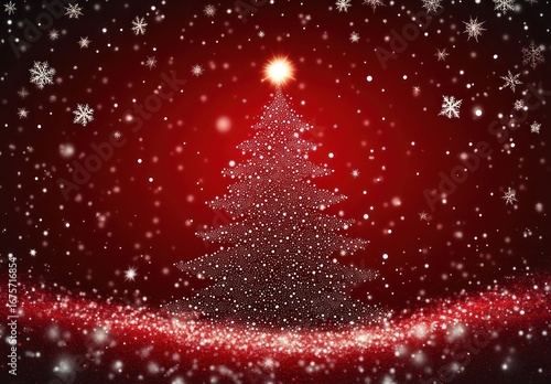 Glowing Christmas tree made of sparkling white dots with a bright star on top set against a red background with falling snowflakes creating a festive winter atmosphere