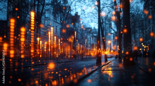 Glowing city street at night, wet pavement, bokeh lights, winter trees.