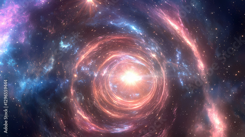 Glowing cosmic cathedral vibrant celestial nebula with arched lights reaching towards radiant star. Luminous Cosmic Cathedral. Illustration