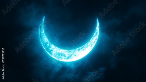 Glowing Crescent Moon: A captivating visual of a vibrant, glowing crescent moon, radiating with ethereal light amidst a backdrop of atmospheric clouds.