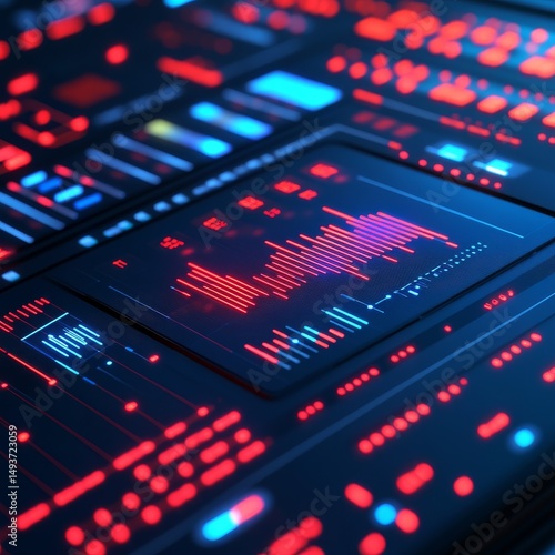 Glowing Data Display Red and Blue Charts on Dark Futuristic Panel , Data, Technology