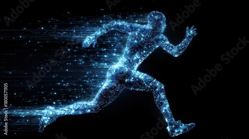 Glowing digital human figure sprinting, symbolizing AI and technology