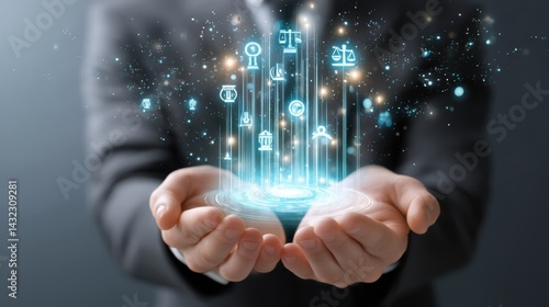 Glowing digital icons and networks floating above cupped hands symbolizing technological innovation and the future of computing and data driven applications