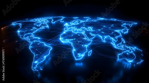 Glowing digital world map showcasing global connections and data flow in a dark background