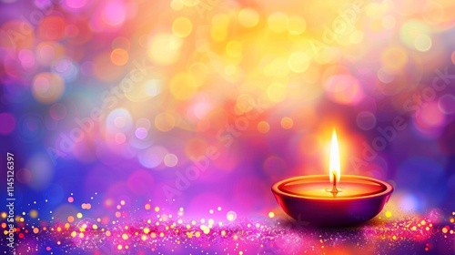 Glowing Diwali diya oil lamp with vibrant flame, surrounded by colorful bokeh lights, creating a warm and festive ambiance.