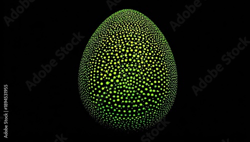 Glowing egg made of tiny green-yellow dots, contrasted against a deep black background