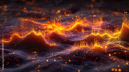 abstract, digital, art, glowing, ember, landscape, hill, particle, sparkling, fire, orange, dark, texture, energy, light, heat, wave, dynamic, high-coloured, intense, illuminated, cosmic, fantasy, surreal, bright, fiery, radiant, vibrant, dazzling, shimmering, glittering, iridescent, magma, lava, molten, hot, burning, design