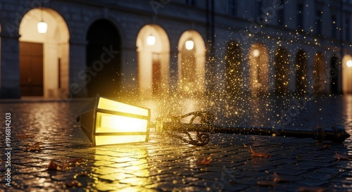Glowing fallen street lamp emits brilliant golden particles onto wet cobblestones at night
