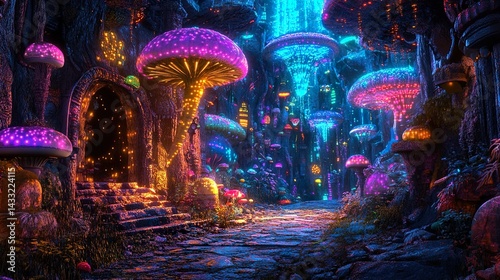 fantasy, glowing, magical, mystical, path, forest, tree, mushroom, light, colourful, vibrant, city, futuristic, nature, illuminated, pathway, adventure, wonderland, dreamlike, imagination