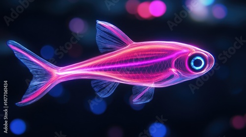 fish, glowing, pink, transparent, neon, bioluminescence, underwater, aquatic, marin, bright, light, digital, illustration, three-dimensional, animation, art, design, nature, high-coloured, colours, abstract, profile, side, view, swimming, water, dark, blur, bokeh, sparkling, beautiful, luminescent, pet, organism, creature, coral, reef, ocean, radiant, radiating