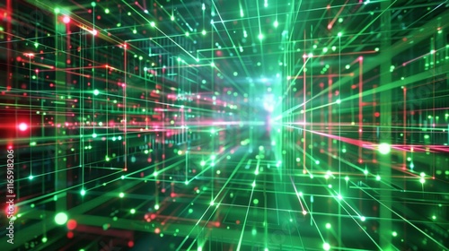 Glowing green and red lines and dots moving through a digital cyberspace grid, creating a futuristic technology background