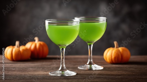 Glowing Green Halloween Cocktails Beside Pumpkins on a Rustic Table Perfect for Celebrating Fall and Creating a Spooky Ambiance